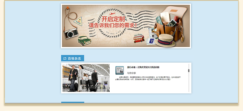 Project Description 百悦逸游于2012年初由二位资深的旅行家创办,是成都传媒集团旗下成都新闻国际旅行社有限公司的高端旅游品牌,总部位于成都高新区天府大道中段美年广场。在百悦逸游成立之前,创始团队亲自到全球三十多个国家实地考察,带着第一手的资讯和执着的信念创立了中国西部第一家真正意义上的私人定制旅行机构。百悦的旅行不是跟团挤大巴,不是十天去十个国家,更不是没完没了的... Official website address 镇江http://www.100.travel I want to share